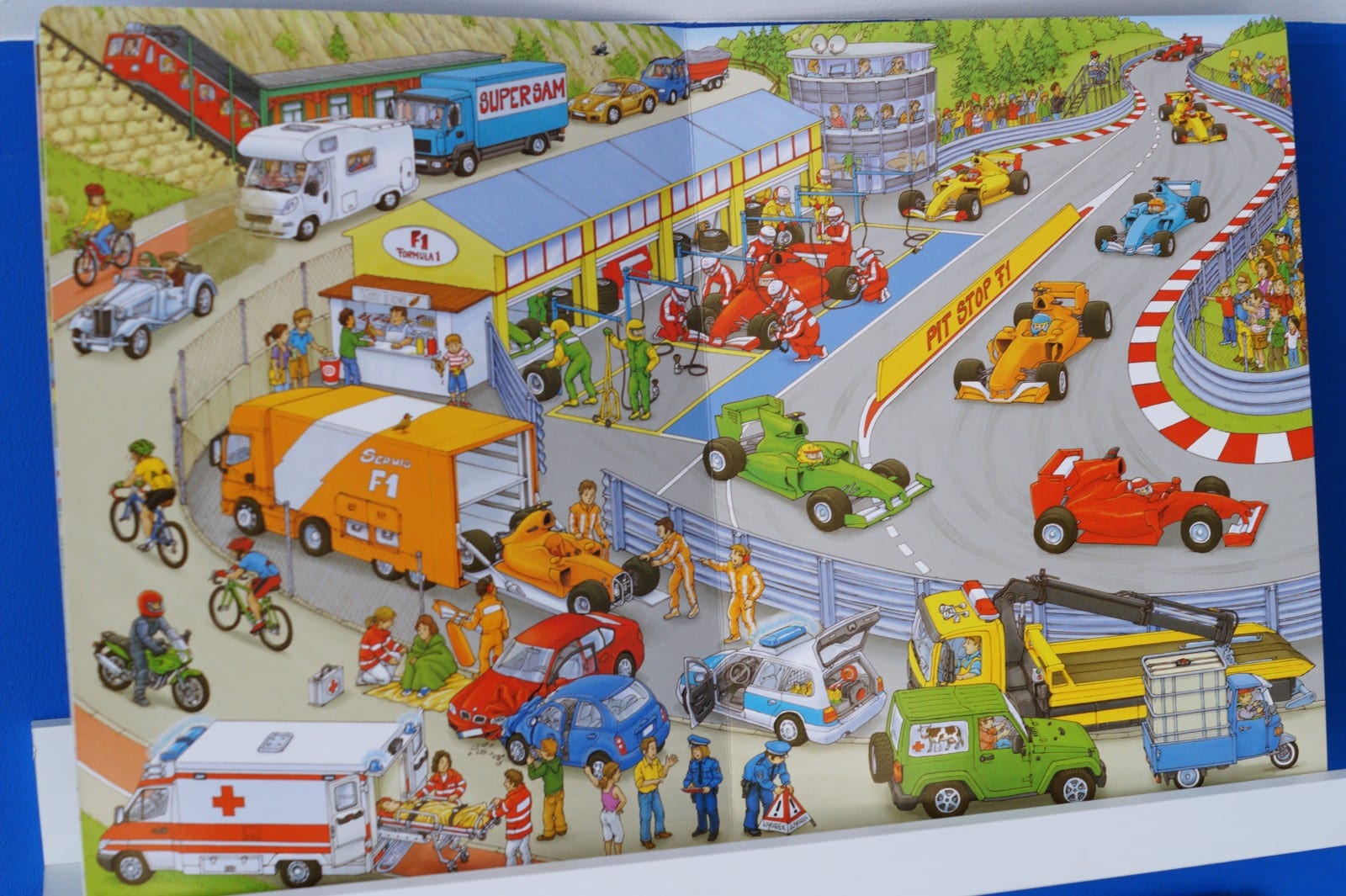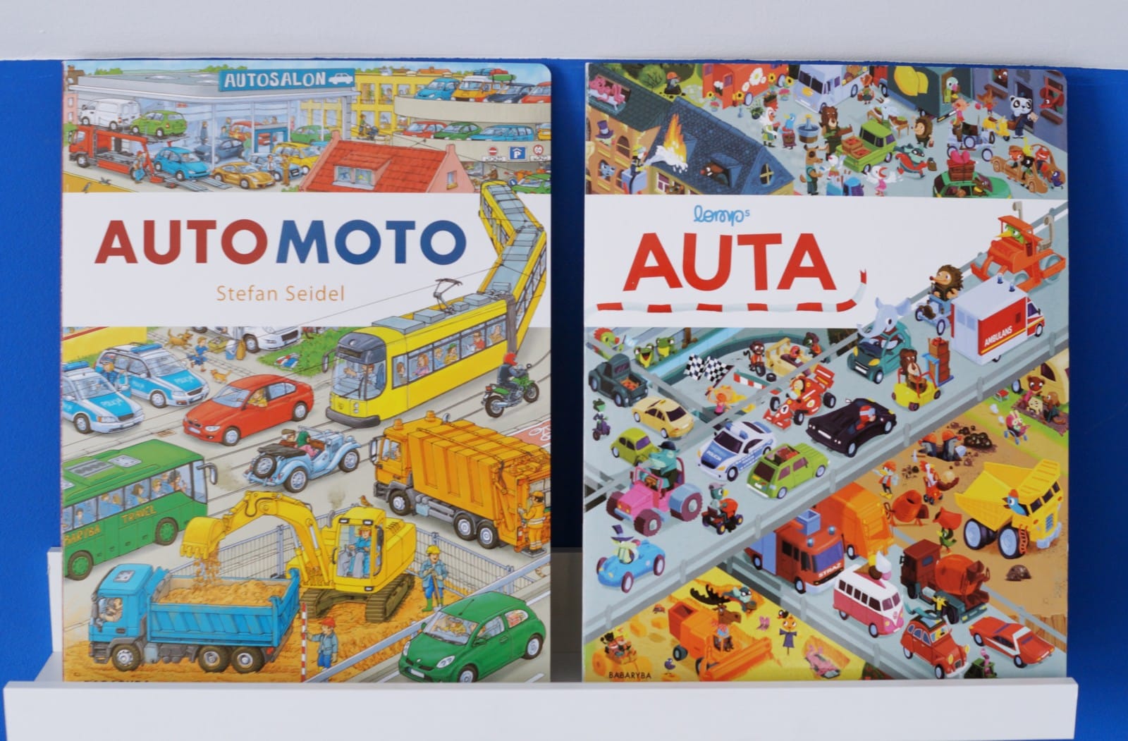 Książeczka AutoMoto Stefana Seidel’a na pierwszy rzut oka wygląda na bardzo podobną do książek Lomp’a. Nic bardziej mylnego. Oprócz sposobu wydania i tematyki, książeczki bardzo różnią się od siebie. W AutoMoto mamy przedstawiony realistyczny Świat. Obrazki są spokojniejsze i przedstawiają sytuacje z życia wzięte. Możemy śledzić przygody  Rolnika Kazika czy Weterynarza Staszka.