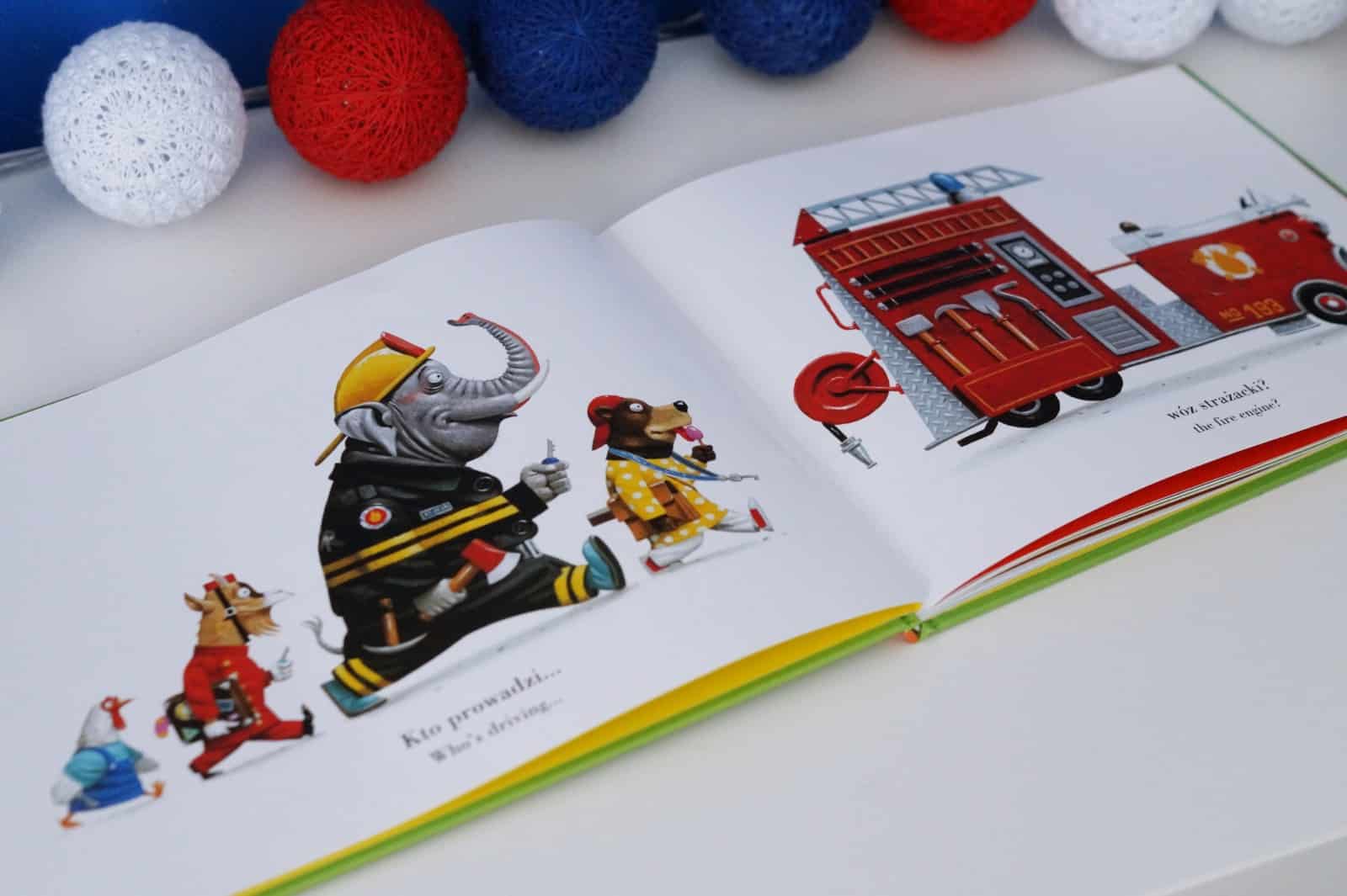 To książeczka dwujęzyczna w formie zgadywanki. Na każdej stronie dziecko może zaproponować jedną z 4 postaci, która prawdopodobnie prowadzi dany wóz. I chyba całkiem nieprzypadkowe jest to, że słoń prowadzi wóz strażacki, świnka traktor, a żyrafa kabriolet. W naprowadzeniu na odpowiedź pomagają również stroje zwierzaków. Na kolejnej stronie dowiadujemy się czy udało nam się zgadnąć. Książeczka w bardzo pomysłowy sposób uczy budować skojarzenia.  Kto prowadzi? to bardzo ciekawa i pięknie wydana pozycja, klasyk, który powinien znaleźć się w wielu dziecięcych biblioteczkach.