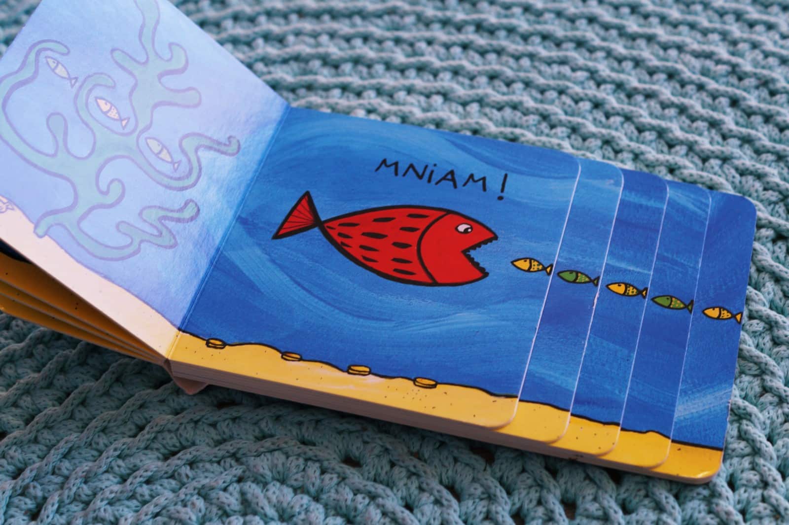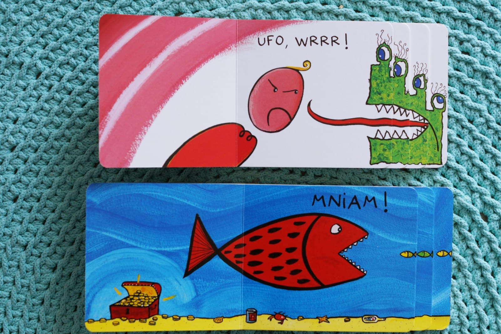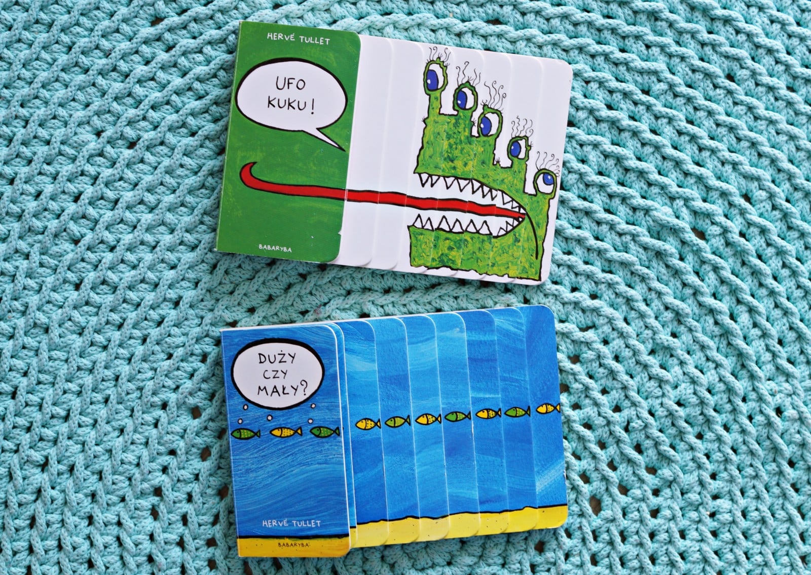 Herve Tullet to autor wielu książeczek, w których z lekkością prezentuje pomysłowe i śmieszne historyjki, dodatkowo opatrzone ciekawymi ilustracjami. We wcześniejszym wpisie pokazywałam Wam już jedną z książeczek z serii schodkowej. Tym razem mam dla Was przygody Ufo i dużej/małej rybki. Czytając “Ufo Kuku!” zawsze gimnastykujemy nasze języki i robimy dziwaczne miny. Natomiast w przypadku książeczki o rybkach “Duży czy mały” Antek zawsze robi ze swoich rączek olbrzymią paszczę ryby, która połyka mniejsze rybki, choć na koniec okazuje się, że chyba jednak wcale żadnej nie zjadł.
