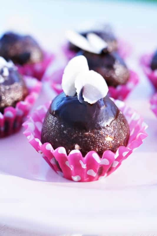 Orzechy i migdały zmieliłam na krem, dodałam mleko, ksylitol, kakao i zmiksowałam. Sprawdziłam smak i konsystencje i dosypałam płatki owsiane i znów zmieliłam. Formowałam małe kuleczki, które polałam rozpuszczoną gorzką czekoladą i posypałam wiórkami i migdałami.