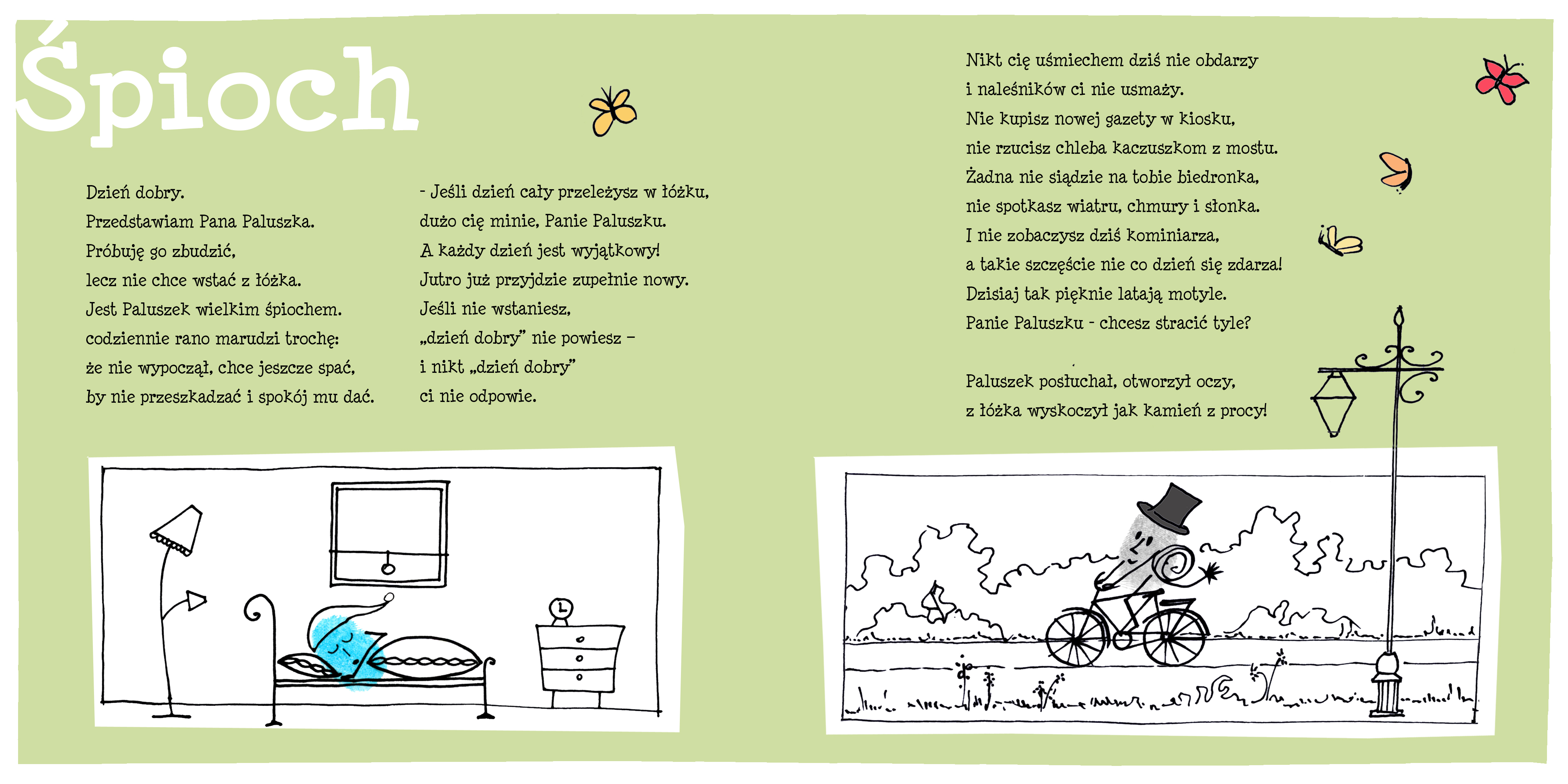 Ja wiem, że 99% populacji wymienia spanie jako ulubioną czynność, podczas której nie dość, że odpoczywa ciało – to jeszcze w gratisie mamy fajowe sny. Zdradzę Panu jednak sekret – na jawie jest jeszcze fajniej! Można zajadać się borówkami bez opamiętania, grać w piłkę z kumplami „z dzielni”;), turlać się z mamą po podłodze i budować z Lego skomplikowane budowle (jak np. sieć marketów Biedronka;) Można skakać po łóżku, zorganizować z tatą bitwę na poduszki, nauczyć się jeździć na rowerze i podjadać mamie „Michałki” z tej sekretnej szuflady (tak sekretnej, że wszyscy o niej wiedzą;) Można poszukać kolorowych kapsli i rozegrać nimi ekscytujący mecz, wspiąć się na tę wysoką śliwę w ogrodzie i słuchać zawodzenia mamy, że przecież nie wolno! A na koniec dnia można przytulić się do rodziców i dać sobie przeczytać jakąś super książkę na dobranoc (o, na przykład o Panu Paluszku!:) Nie ma co się wylegiwać w łóżku, zatem 1…2….3…POBUDKAAAAAA!