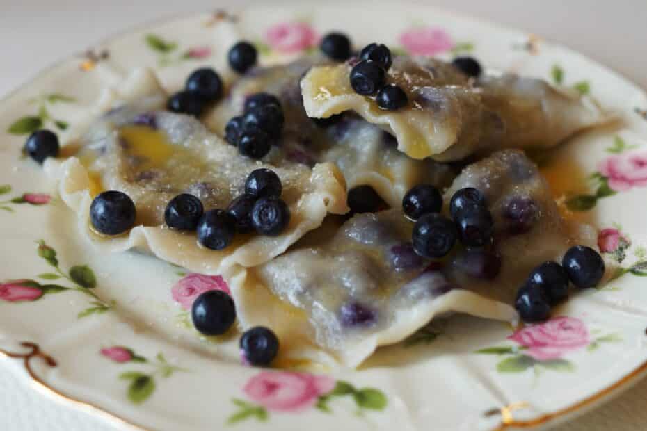 Będąc w ciąży nie miałam jakiś specjalnych zachcianek, jednak kiedy nastał sezon jagodowy od razu zabrałam się za lepienie pierogów z tymi owocami. Jak się okazało po roku, Antek bardzo lubi pierożki z jagodami.