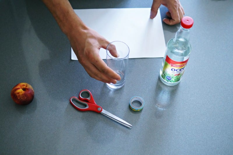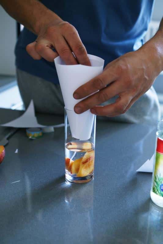 Kolejny krok to przygotowanie lejka z papieru. Zwińcie kartkę tak, aby po jednej stronie powstał Wam stożek. Obetnijcie końcówkę i dopasujcie lejek szerokością do wymiarów szklanki. Kartka nie powinna dotykać mikstury. Następnie kartkę sklejcie wzdłuż taśmą, aby zachować kształt lejka. Sprawdźcie czy wszystko wyszło tak jak trzeba, lejek powinien opierać się na szklance. I najważniejsza sprawa!!! Teraz musicie obkleić dookoła szklankę razem z lejkiem. Inaczej muszki będą uciekać!!!!!.