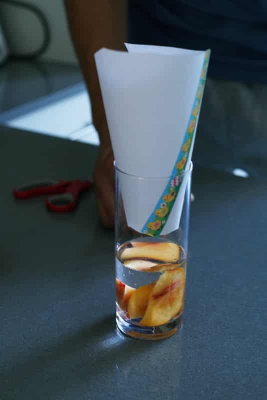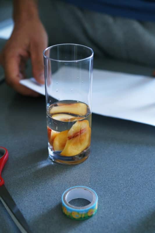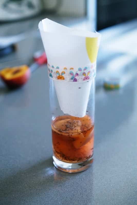 Zaczynamy od przygotowania mikstury. Jeśli korzystacie z tej drugiej po prostu wlejcie odpowiednie ilości płynów, jeśli z pierwszej pokrójcie brzoskwinie i zalejcie ją octem.