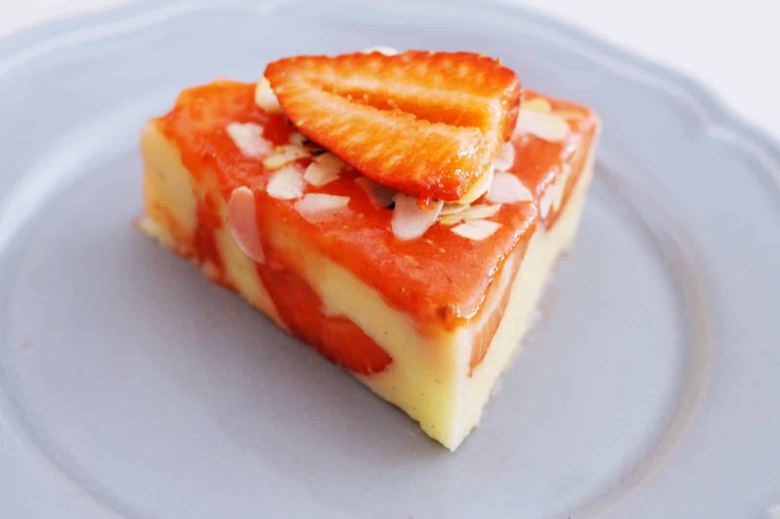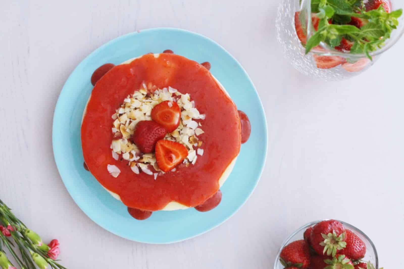Ugotuj kaszę jaglaną wg zaleceń na opakowaniu. W między czasie rozpuść galaretkę i żelatynę w szklance gorącej wody. Kaszę ( może być ciepła) zblenduj z dodatkiem mleka kokosowego. Konsystencja powinna być idealnie kremowa, bez widocznych grudek. Dodaj rozpuszczoną galaretkę z żelatyną i wymieszaj dokładnie całość. Sprawdź smak, jeśli potrzebujesz, dosłódź. Moja tortownica przecieka, jeśli wleje do niej zbyt płynną masę. Dlatego masę schładzam przez pół godz w miseczce, aż zacznie gęstnieć i dopiero wtedy przelewam ją do tortownicy. Dodaj kilka truskawek do środka, zostaw trochę do zblendowania i do udekorowania. Sernik należy umieścić na kilka godz w lodówce. Po tym czasie wyjmij ciasto, wyłóż z formy, polej truskawkami, posyp prażonymi migdałami i udekoruj kilkoma truskawkami.