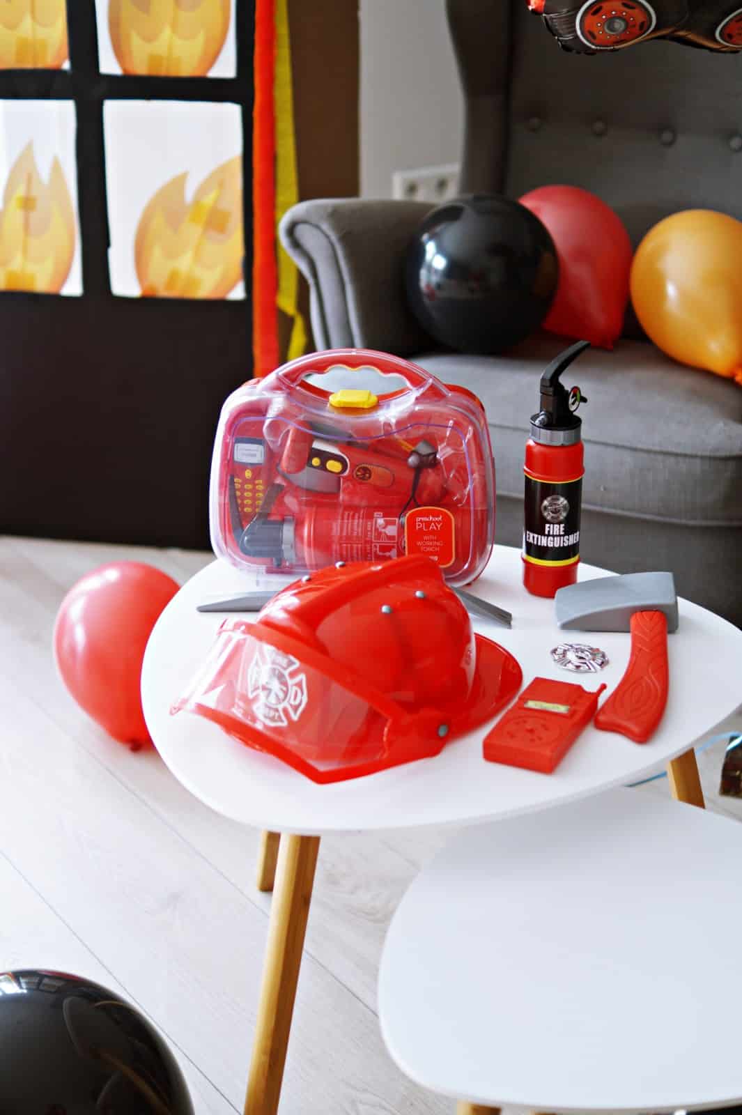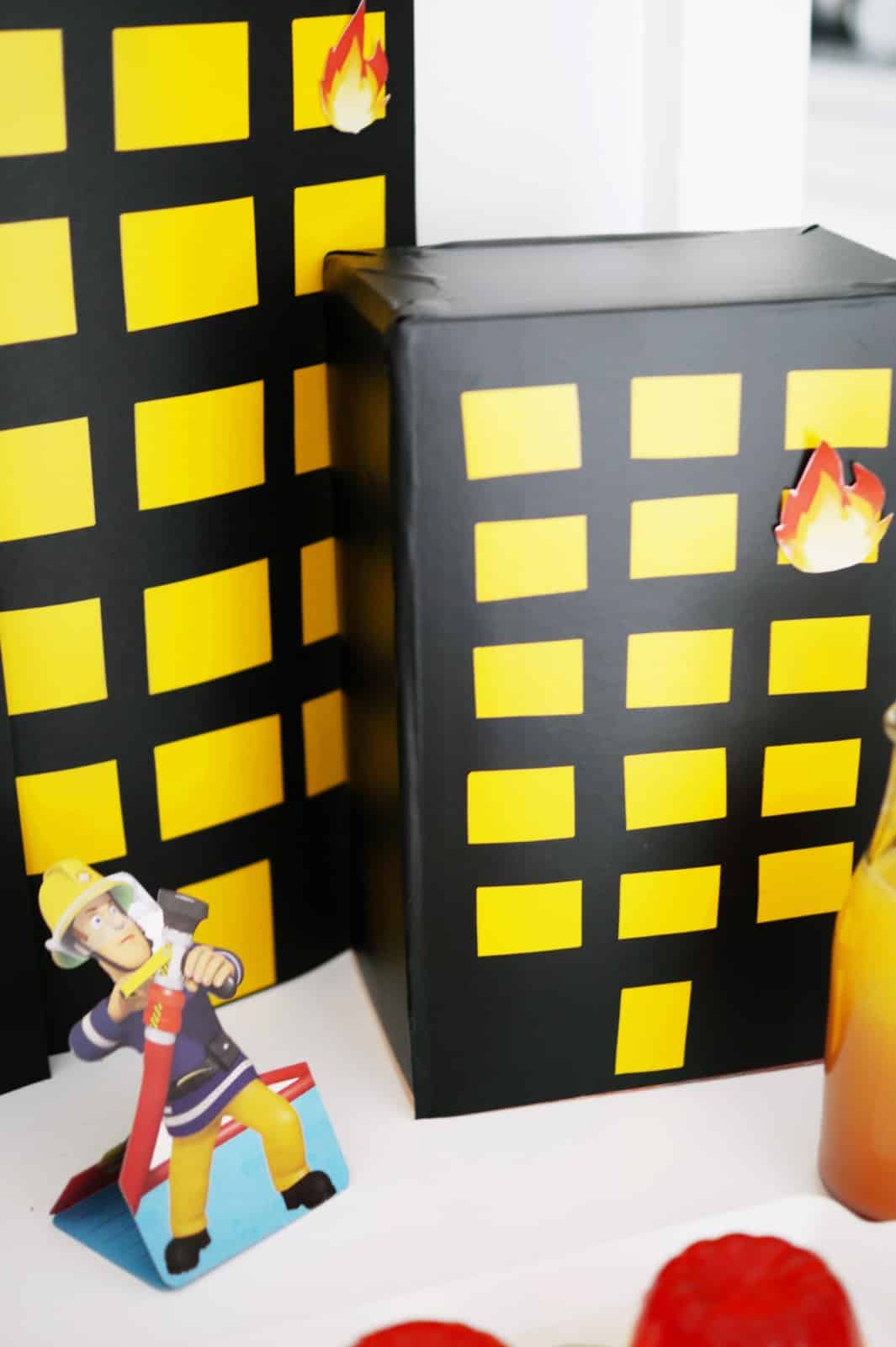 I tak mając to na uwadze, oczywiście wszystko poszło nie tak jak chciałam, coś postawiłam bliżej, a coś dalej, przez co, nie było widoczne na zdjęciach. Aparat przy szaroburej pogodzie całkowicie przestał mi łapać ostrość. A tort całkowicie rozczarował mnie smakiem i wyglądem. I choć moje blogerskie plany wzięły w łeb, potrafię wrzucić na luz w tej kwestii i po prostu cieszyć się rodzinnym czasem. Potem mam tylko więcej roboty. A wiecie co było najważniejsze i najpiękniejsze w tym wszystkim? Antek był całkowicie uradowany. Urodziny z jego ulubionym motywem straży pożarnej był strzałem w dziesiątkę. Nawet Darek przyznał, że wycinanie i oklejanie atrapy bloku o 12 w nocy, to jednak nie był taki głupi pomysł. A dodatkowo ciocie sprawdziły się jako najlepsze animatorki. Ciocia Gosia nawet płonęła w naszym bloku, ale na szczęście Antoś ją uratował (kto oglądał na instastories?) . Ciocia Asia malowała śmieszne miny balonowym strażakom. Antek był zachwycony, kiedy śpiewano mu sto lat, dzielnie dmuchał świeczki, a potem kroił tort i nawet go roznosił. Teraz codziennie przed pójściem spać śpiewamy sobie sto lat, Antek oczywiście kończy, niech żyje, żyje nam … “Toś”. No i dekoracje, które widzicie na zdjęciach zdały egzamin najlepiej jak mogły, bo użytkujemy ich codziennie ( też mogliście zobaczyć na naszym insta stories tu). Codziennie mamy akcje gaszenia pożaru. Dekoracje tak wymyśliłam, aby płomienie można zdejmować i przyklejać na nowo. A oprócz dekoracji dla małego strażaka, były też słodkości pasujące do wystroju, galaretka w kolorach płomieni, płomienny napój i owoce w kolorach czerwonym, pomarańczowym i żółtym. I oczywiście muffinki, tym razem marchewkowe. Niebawem na blogu pojawi się przepis 😀
