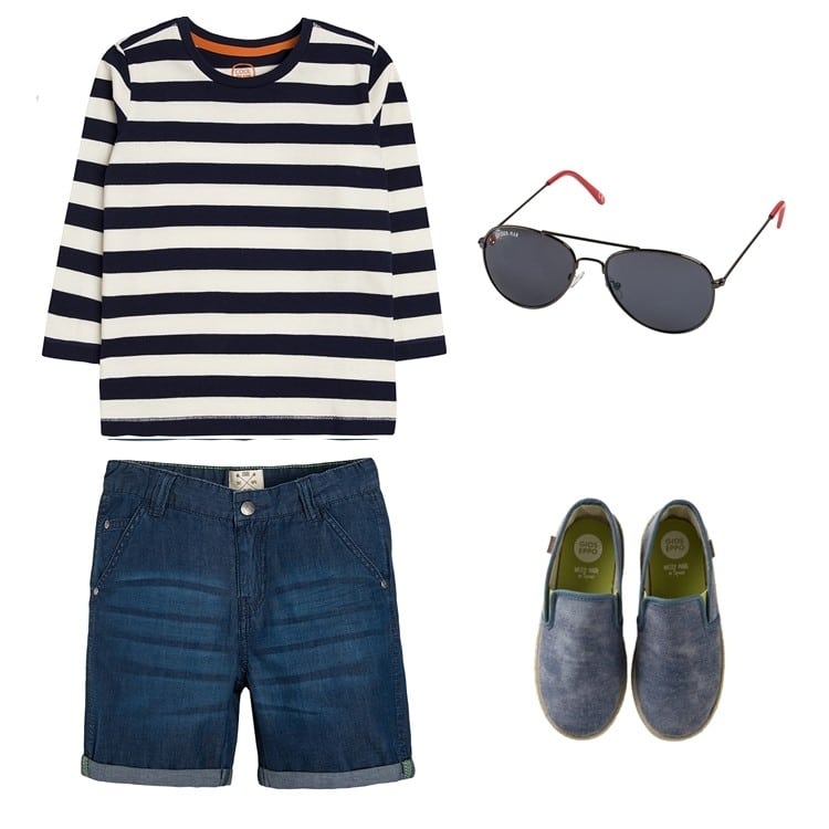 Poniżej znajdziecie kilka moich propozycji na bardzo proste, nie przerysowane wakacyjne stylizacje dla chłopców. Pierwsza, propozycja jest w stylu marynistycznym. Latem bardzo chętnie ja i Darek wybieramy granatowe ubrania w paski lub gładkie. Wystarczy jeden ciekawy T-shirt i cała rodzinka ma morską stylówkę.