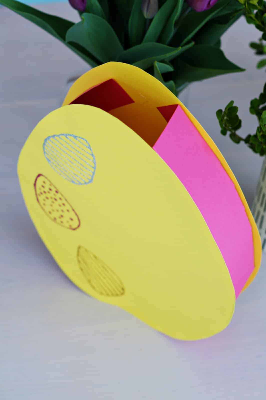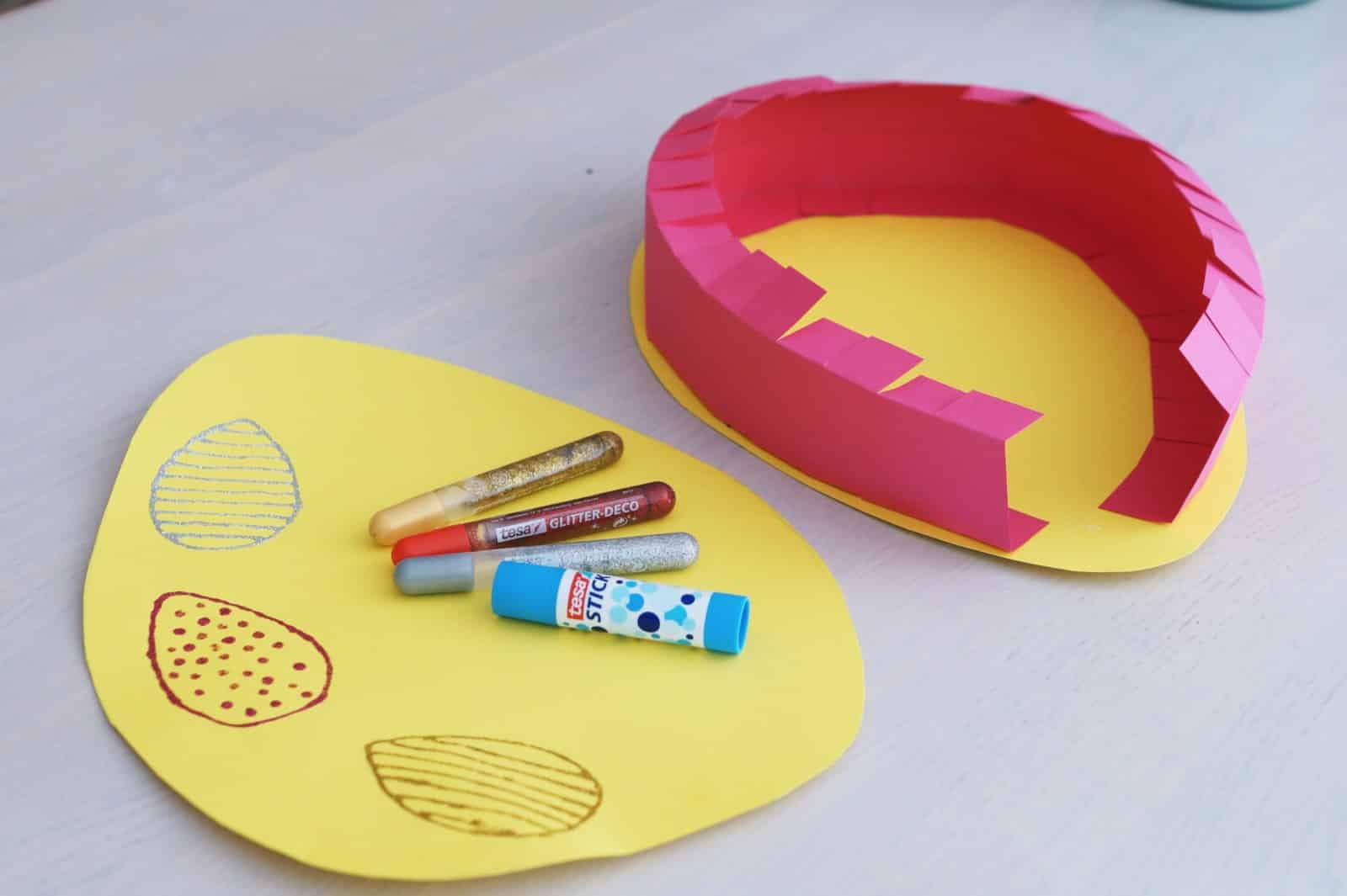 W pierwszej kolejności przygotuj szablon jajka. Złóż kartkę A4 wzdłuż i narysuj połowę jajka, dzięki czemu jajko będzie symetryczne (tak jak w przypadku serduszka). Odrysuj i wytnij jajka na kolorowym brystolu. Teraz ścianki. Moje jajko ma 6 cm grubości. Wycięłam paski na szerokość 12 cm, po 3 cm na zakładki i 6 cm na ściankę. Wycięłam 2 takie paski z dłuższego boku brystolu A2. Zaznaczyłam po 3 cm na zakładki i ponacinałam je w niewielkich odstępach. Jedną stronę zakładek posmarowałam klejem i nakleiłam tak jak na zdjęciu, tworząc niedokończone jajko. Otwór ułatwi doklejenie kolejnego jajka, oraz umożliwi włożenie prezentów. Przednią część jajka możecie dowolnie udekorować, ja użyłam pisaków z brokatem. Możecie też zlecić tę czynność dzieciom. Antosia jajko przygotowała sama, kolejne zleciłam do przygotowania chrześniakowi. Będzie zaskoczony w Święta, że jego jajko zamieniło się w jajo z prezentami. Chyba nie trzeba się długo przyglądać, które wyszło ładniejsze :D.