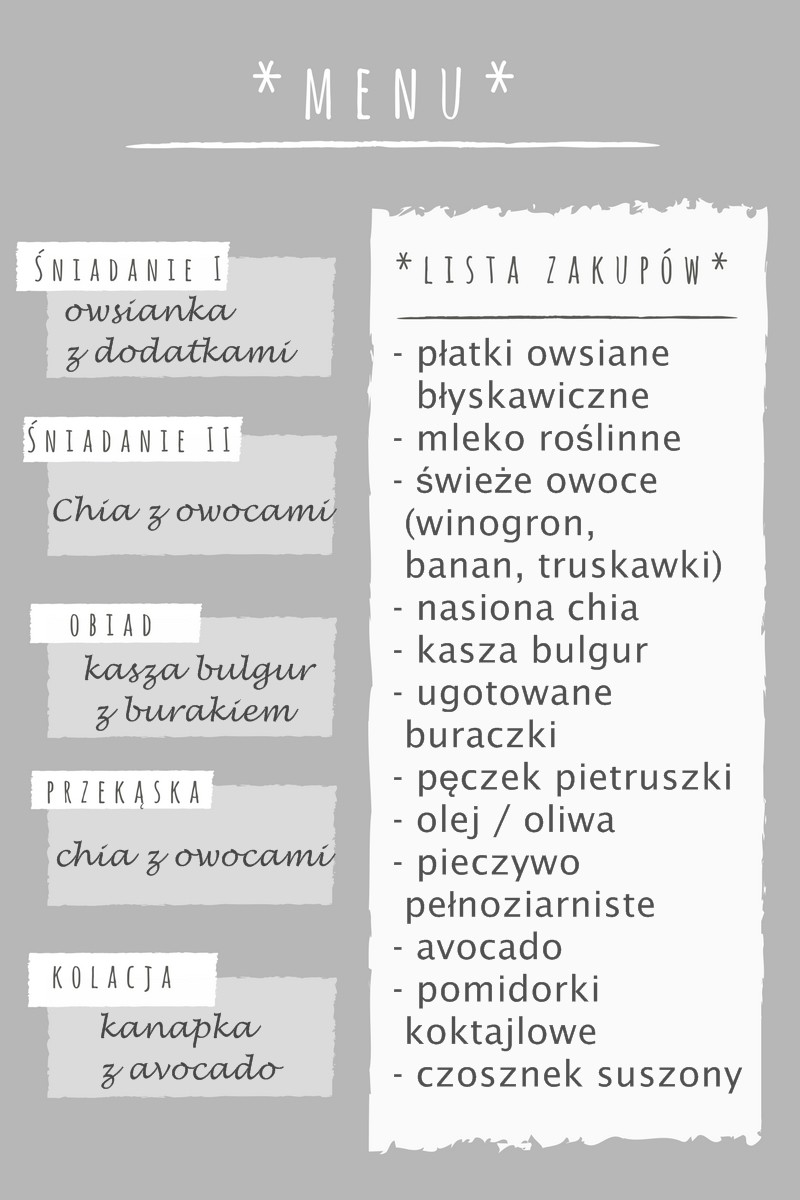 Kolejnym moim krokiem jest organizacja wszystkich moich posiłków podczas diety rozdzielnej (nie łączę w niej białek zwierzęcych z węglowodanami). Taki plan pozwoli mi kontrolować wszystko co jem, ale też w pełni wykorzystywać wszystkie produkty. Na przykład kupując mleko migdałowe, które kosztuje 16 zł, staram się je wykorzystać w ciągu kilku dani, tak aby się nie zmarnowało. Dzięki temu nie kupuje nic z nadwyżką i nic się nie marnuje. Listę z zakupami na jeden taki dzień znajdziecie poniżej, a dokładne przepisy na poszczególne posiłki TUTAJ.